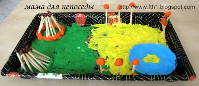 Образовался у нас перерыв в пол-часа и нужно было срочно занять чем то Алона, который от безделья и недостатка внимания  уже лез на стены и на погруженного в интернет папу. На мое счастье, идея очередного шедевра уже прочно сидела у меня в голове, а материалы были заготовлены заранее и ждали своего часа. Последующие пол-часа моего ребенка не было слышно... Итак, чем же мы занимались? Ну конечно же ландшафтным дизайном! Техническая сторона этой работы была изучена на уроке изобразительного искусства (помимо обычного рисования дети работают также и с пластилином), а идея взята из дневника мамаолаола (пост "Панорама пляж"). Итак, целью нашей работы было изобразить морской пляж гостиничного комплекса. Именно так. Алон с нежностью вспоминает наш отдых в гостинице на Мертвом море и и на озере Кинерет и все время просится обратно. Я описала Алону примерную разметку: какую площадь займет травка, какую - песочек, а где поставим вогнутую пластмассовую крышечку с "морем" (я планировала налить туда воды, но сын решил замазать ее голубым пластилином). От пластилина Алон отрывал маленькие кусочки, скатывал из них шарики и затем пальчиком размазывал по дну коробки.