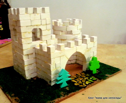 На этом литературном фоне решила сделать с детьми тематическую поделку по сюжету книги. Кирпичи для желтой дороги у нас уже имелись в наличии (золотистая мозаика неправильной формы, которую я купила пару месяцев назад для строительства ханукального подсвечника на школьную выставку). Как выстраивать ландшафтный дизайн по обеим сторонам дороги - никто понятия не имел: ни я, ни дети. Тут на глаза попался набор для строительства замка.